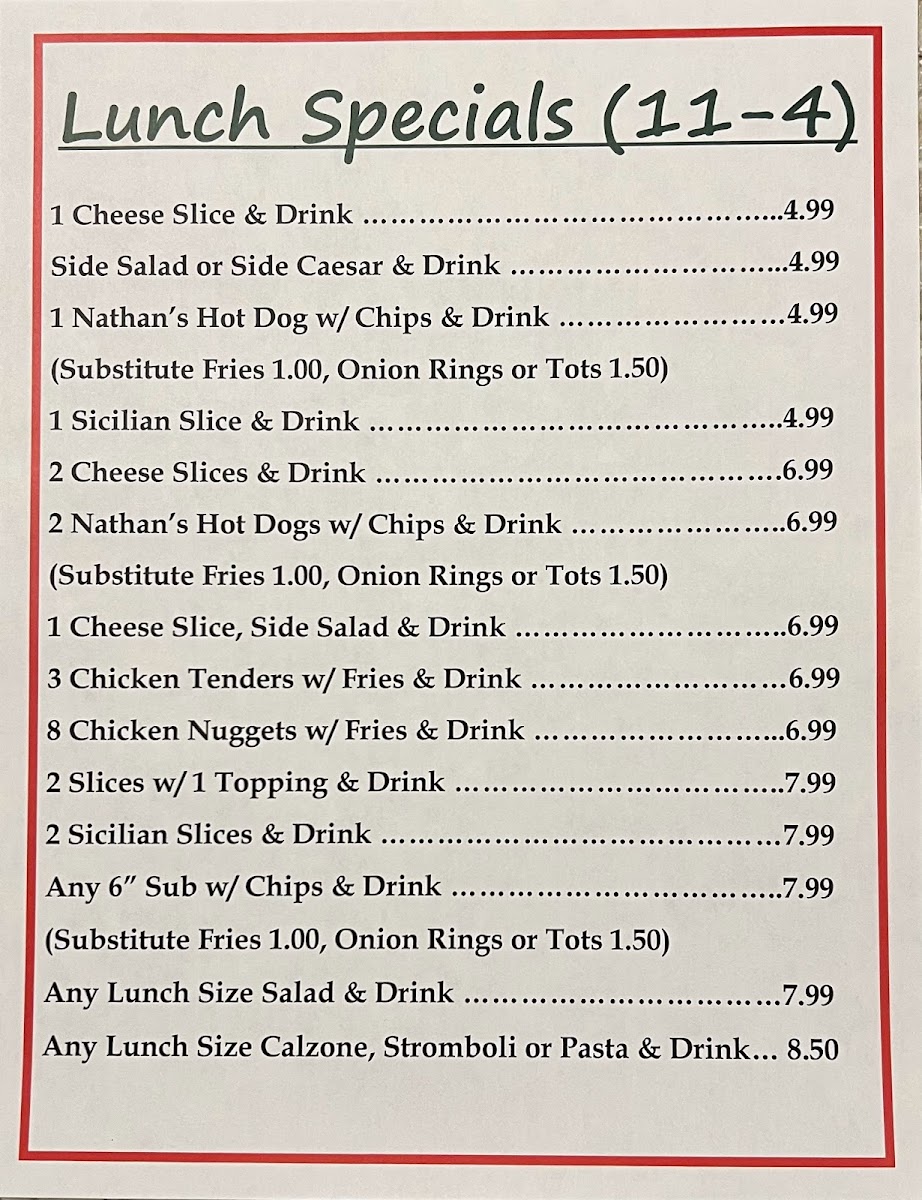 For those looking for a quick meal, their Lunch Specials are available from 11-4 Monday to Saturday and 12-4 Sunday, offering great value like 1 Cheese Slice & Drink, Side Salad or Side Caesar & Drink, and even Nathan's Hot Dog with Chips & Drink.