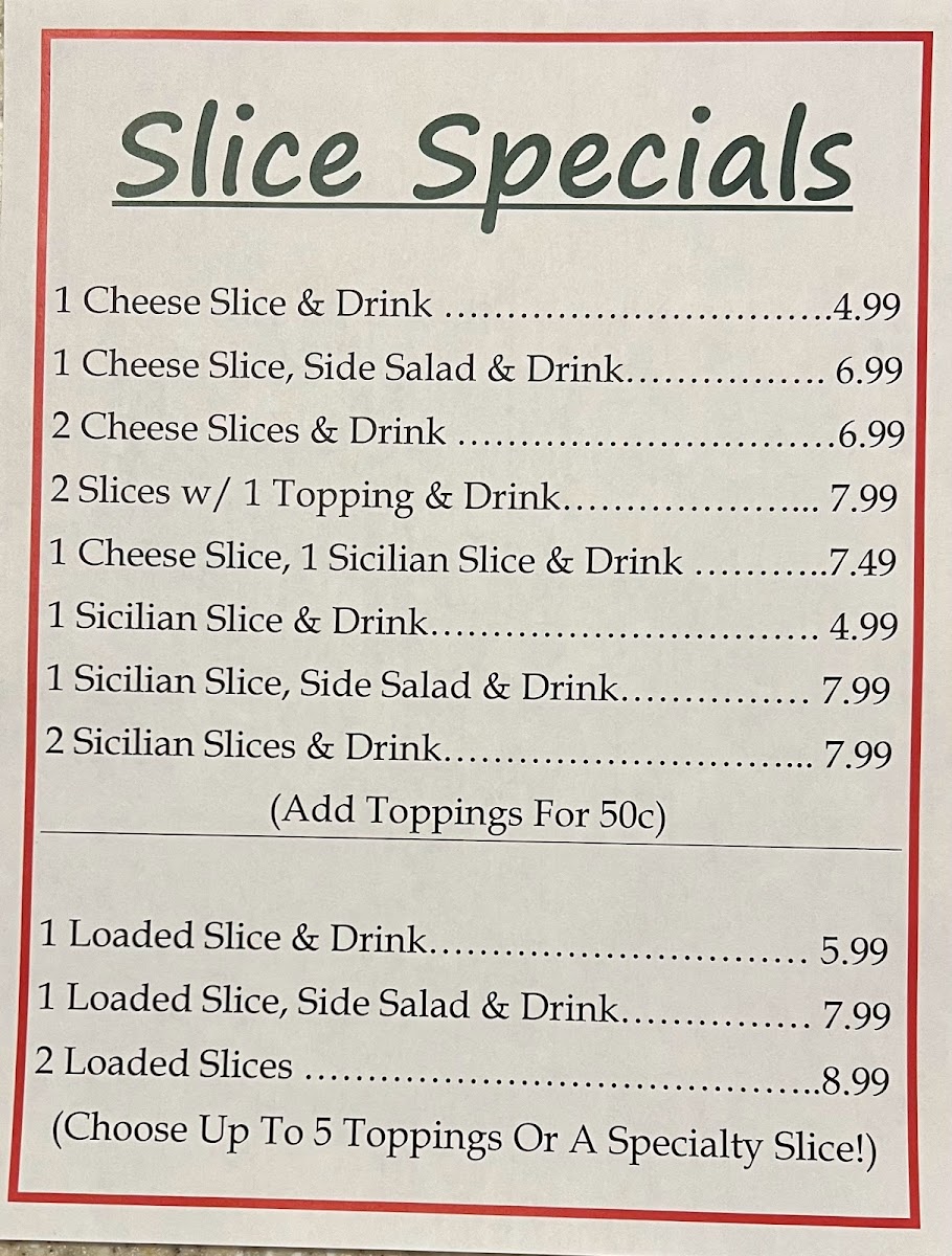 The Slice Specials are available all day for dine-in or take-out, with options like 1 Cheese Slice & Drink, 2 Cheese Slices & Drink, and more. Their Appetizers are equally irresistible, including Mozzarella Sticks, Garlic Knots (6), and Pickle Chips, among others.