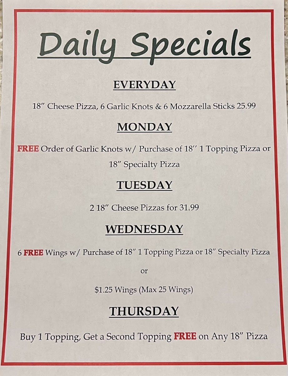 Namoli's Ny Pizzeria offers a diverse and tempting menu that caters to a wide range of tastes, making it a perfect spot for any occasion. The menu is full of delicious options, starting with their Daily Specials. Every day, you can enjoy the Family Special, and on Monday, they offer a FREE Order of Garlic Knots with the purchase of an 18" 1 Topping Pizza or 18" Specialty Pizza. On Tuesdays, you can explore other tempting deals.