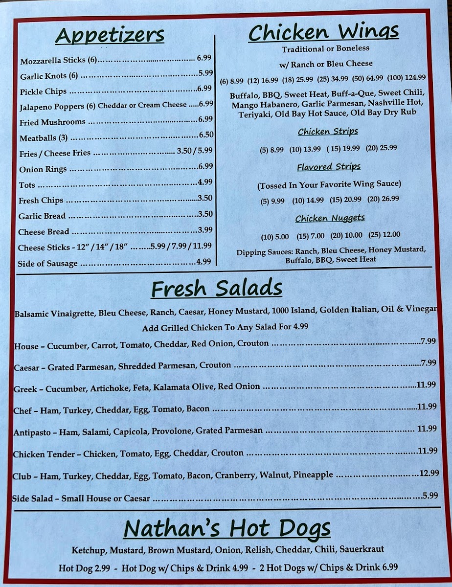 For a hearty meal, the Deli Subs are a great choice, available in sizes from 6" ($6.99) to 16" ($13.99), and come with chips, or you can substitute them for fries or onion rings for a small extra charge.