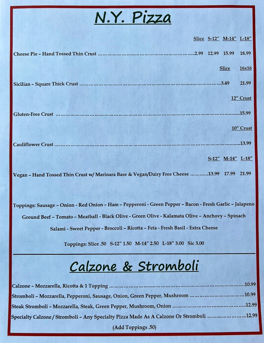 Sausage, Pepperoni, Ham, Ground Beef, Red Sauce 12" 17.50 / 14" 21.50 / 18" 24.99 / Sic 26.99
