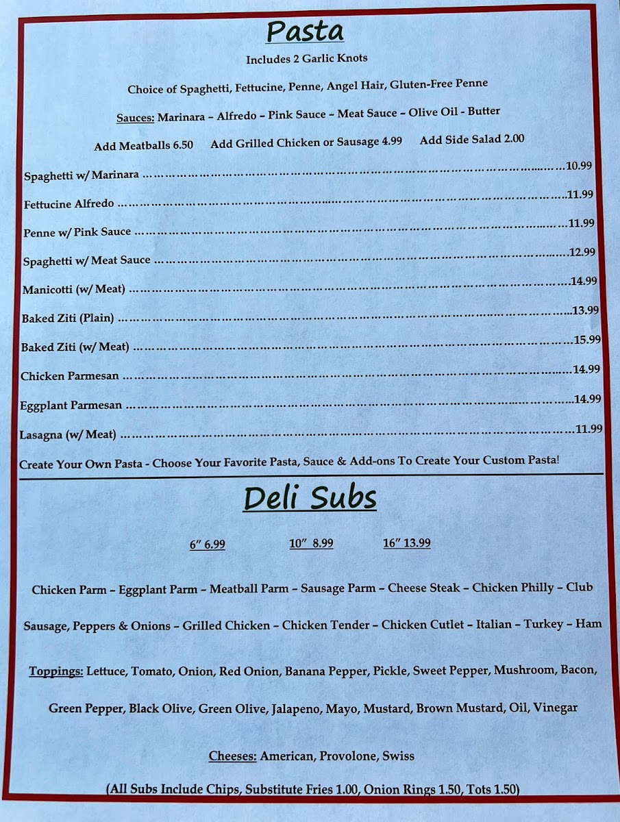 Their Calzone & Stromboli are customizable with the option to add toppings for just $0.50. If you’re in the mood for pasta, they offer classic choices like Spaghetti, Fettucine Alfredo, and Penne, with a variety of sauces including Marinara, Alfredo, and Pink Sauce. Add-ons like Meatballs and Grilled Chicken are available to complete the dish.