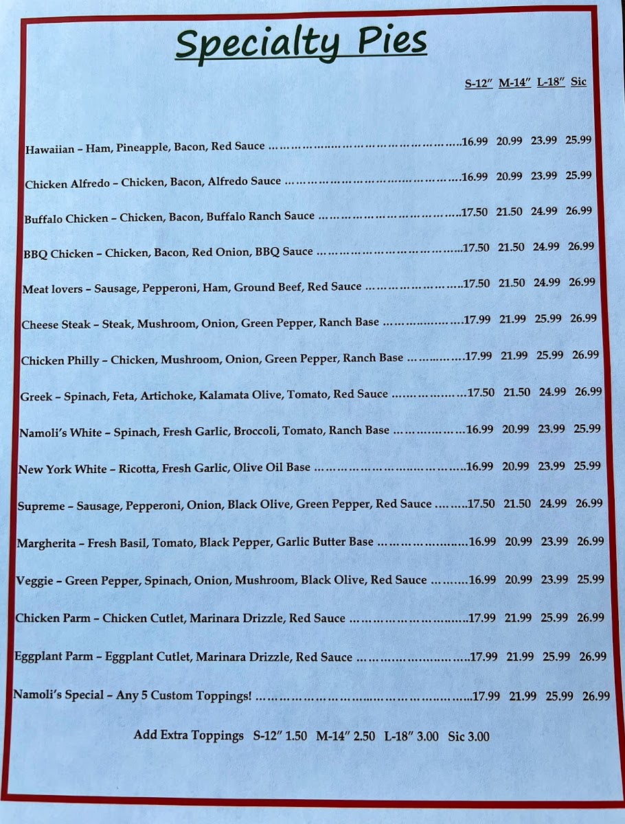 Ham, Pineapple, Bacon, Red Sauce 12” 16.99/ 14” 20.99/ 18” 23.99/ Sic 25.99