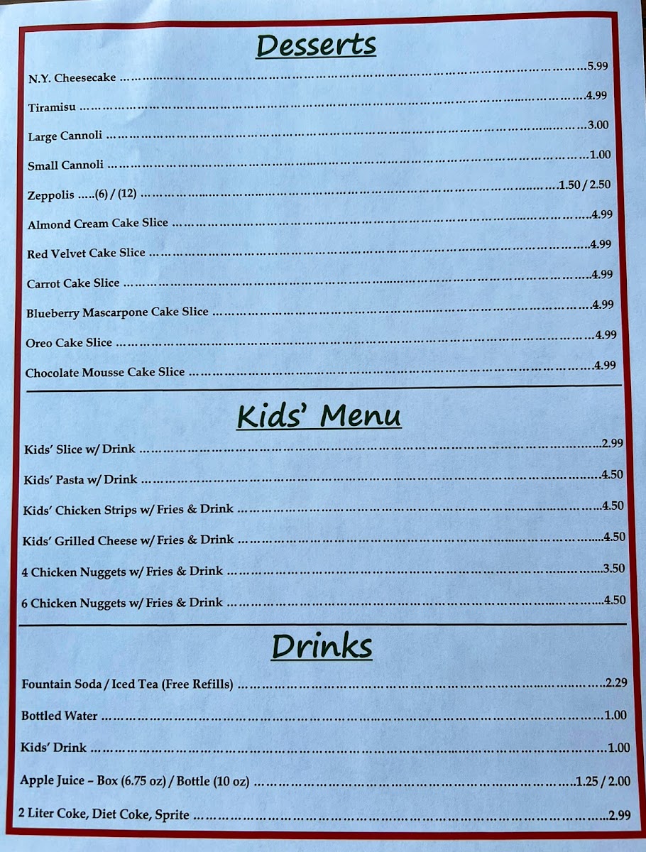 Finally, no meal is complete without dessert, and Namoli's offers sweet treats like N.Y. Cheesecake, Tiramisu, and Large Cannoli. Wash it all down with a Fountain Soda, Iced Tea, or a 2-liter Coke.